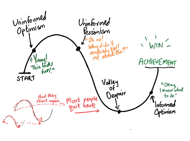 3. Valley of Despair: This is the most challenging stage. Frustration, disappointment, and even self-doubt creep in. You might question your abilities, the viability of your project, or whether it's even worth continuing. Many people give up at this stage.